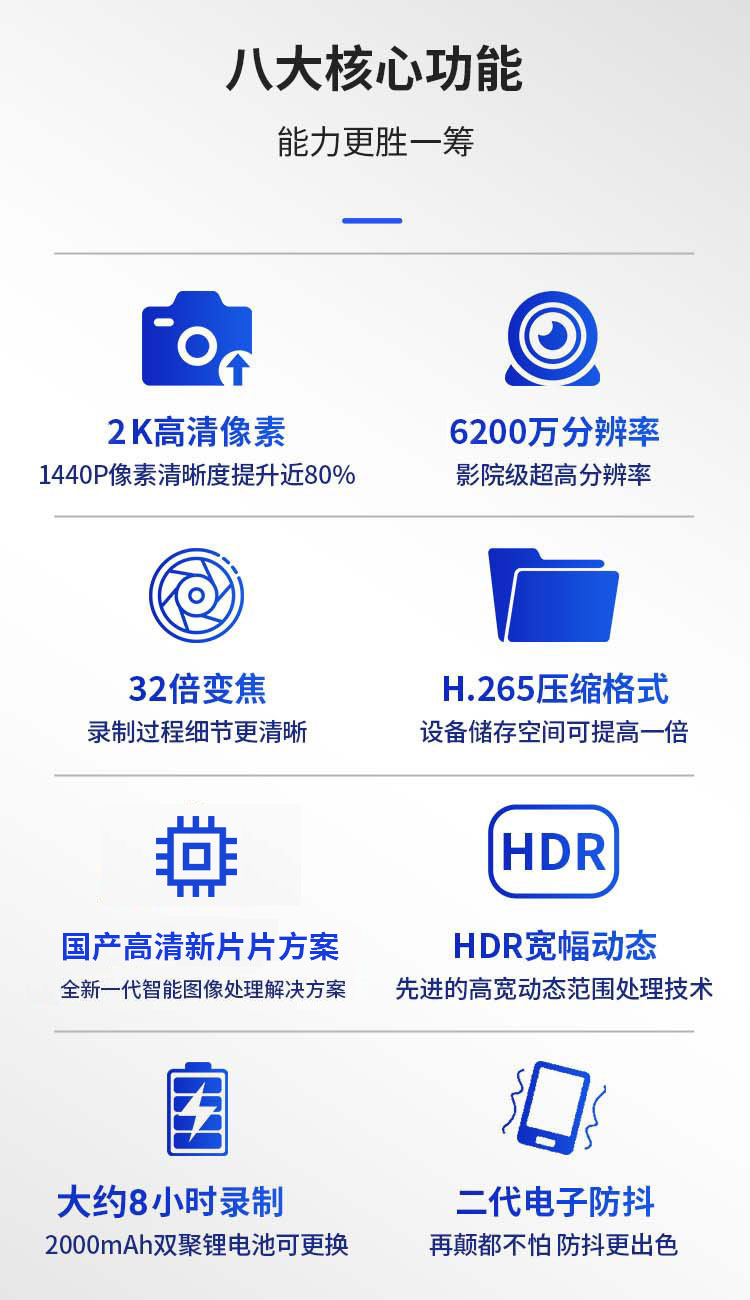 本機(jī)采用的可拆卸鋰電池2000毫安,更換一次電池1080P分辨率下可連續(xù)工作時(shí)間14小時(shí)以上。隨時(shí)隨地進(jìn)行執(zhí)法記錄。標(biāo)配2塊電池,另可根據(jù)需要配備外接電池盒,實(shí)現(xiàn)超長(zhǎng)續(xù)航時(shí)間。