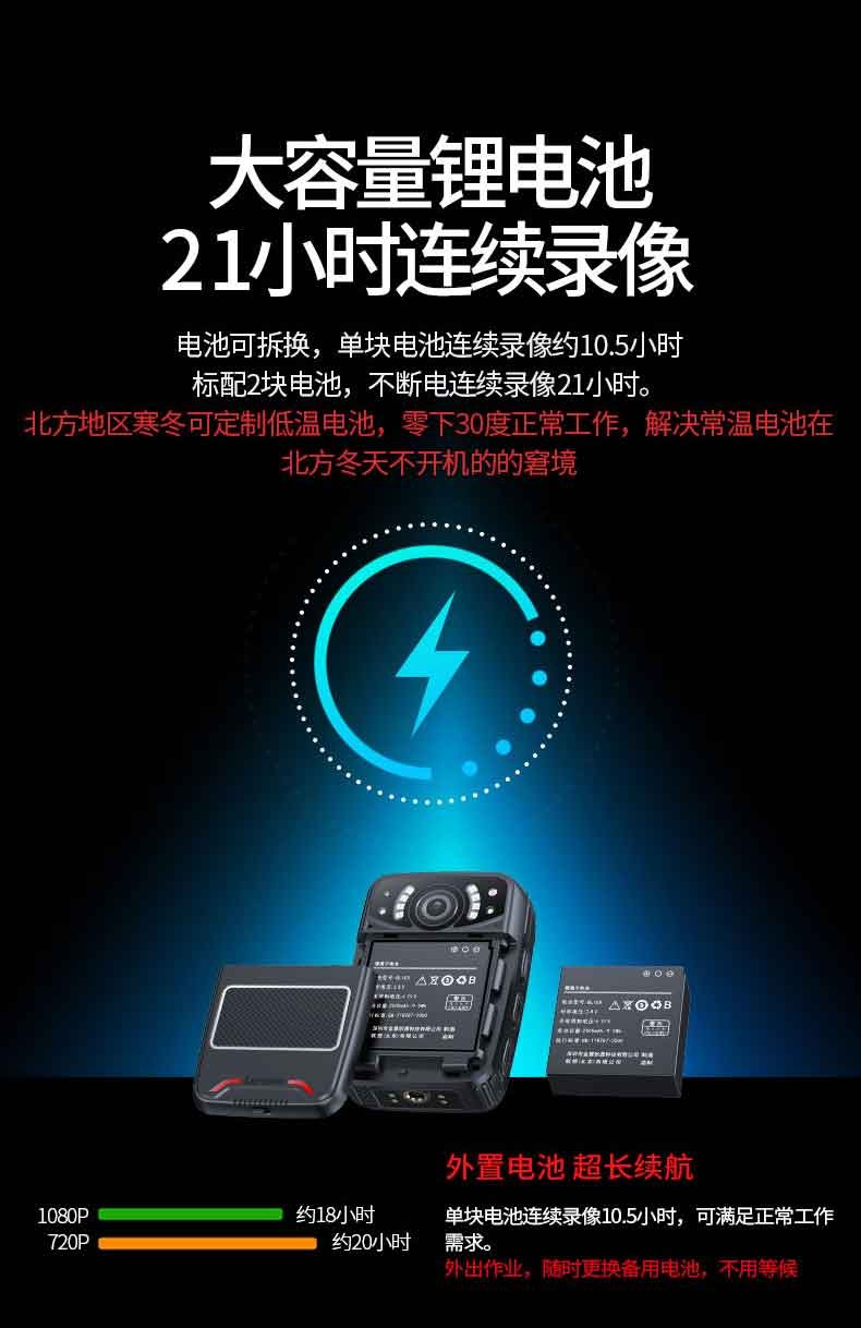 可更換電池,在拆換電池時主機不斷電,一次充滿可連續(xù)錄像10小時,主機電池在座充上充電時間2小時;